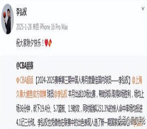 2025年1月,李弘权凭借12月的月度最佳表现,代表上海出战10场比赛,取得8胜2负的战绩,场均上场36分钟,砍下19.4分、5.7篮板、1.9助攻,同时能够以51.3%的惊人命中率场均投进4.1记三分球。李弘权也凭借他在联赛中的出色表现入选了新一期国家集训队。