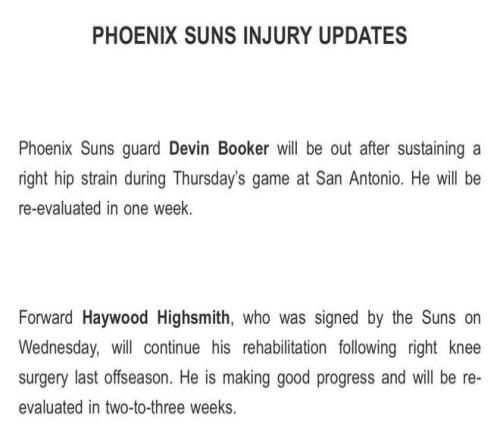 太阳官方更新伤情:布克髋部拉伤至少缺1周海史密斯23周后复查