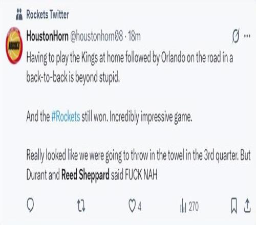 休媒:先是帮助火箭击败国王,随后又客场挑落魔术,NBA的赛程设置的很不合理,但火箭还是赢球了,第三节我们就要放弃时,杜兰特、谢泼德挺身而出说NO。
