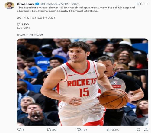北京时间2月27日,休斯顿火箭队迎来背靠背的第二场比赛,此役阿门-汤普森从疾病中恢复重返先发,里德-谢泼德回到替补阵容,但此役帮助球队拿下胜利的奇兵依旧是谢泼德,他在下半场狂揽17分帮助火箭完成了19分的大逆转,谢泼德至少是此役的第二功臣。