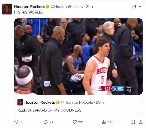 当终场前22.1秒谢泼德三分命中,将比分改写为109-102时整个火箭替补席都沸腾了,看台上熙熙攘攘的火箭球迷们高兴到跳跃,谢泼德自己也怒吼释放起来。