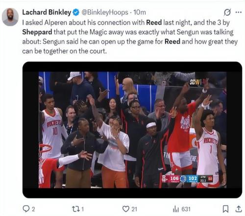 火箭记者兰德里-宾克利赛后写道:我昨晚跟申京聊天,申京认为谢泼德有在比赛时刻打破僵局的能力,而且申京觉得他搭档谢泼德时球队发挥更出色。