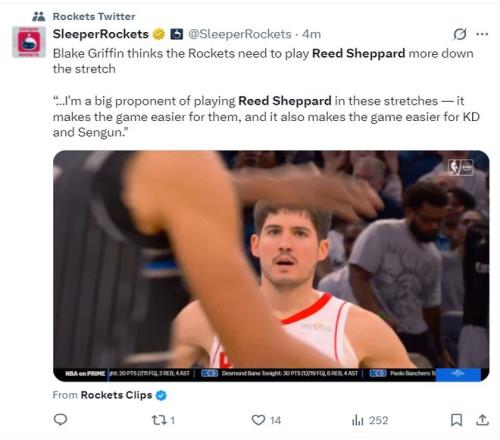 格里芬在直播间谈到谢泼德:火箭队应该在比赛的决胜时刻让谢泼德多登场,火箭队的进攻有申京、杜兰特、谢泼德时明显最出色。