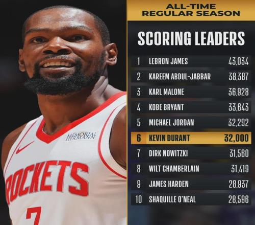 首节杜兰特6中1仅得4分,但他迅速调整状态,比赛结束时把投篮命中率拉回到五成。美中不足的是,外线失准了。杜兰特本场达成多项里程碑:1、37岁151天成为火箭队史最老的40+球员;2、生涯总得分突破32000分,历史第六人。