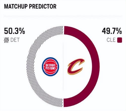 赛前,美媒ESPN对本场比赛进行了预测,活塞胜率为50.3% ,骑士胜率则为49.7% ,算是平分秋色了。