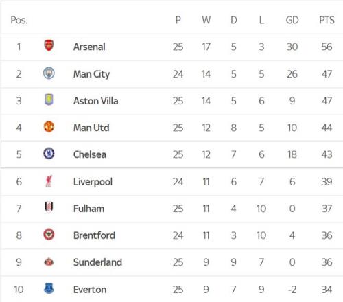 24轮之后,阿森纳以53分领跑,曼城、维拉分别以47分、46分排名第2、3位。尽管阿森纳近4轮仅取得1胜2平1负的成绩,但曼城没有抓住追分良机,同样4轮只拿到了5分。