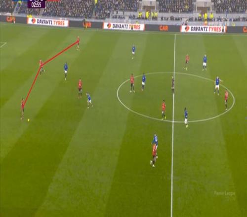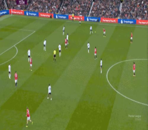 在没有固定且典型的中锋角色的情况下,曼联实际上是在用跑动牵制对手,从而绕进两线之间: