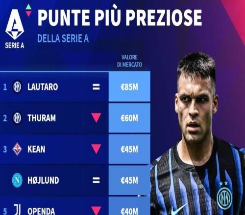德转列意甲各队身价第一:劳塔罗8500万欧领衔,最低仅750万