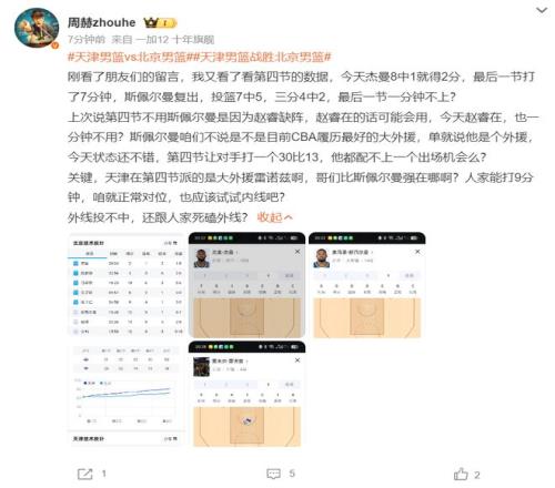 媒体人周赫对北京这场失利非常不满,他认为末节该弃用的是8中1的杰曼而非斯佩尔曼,因为末节天津是用雷诺兹,北京这边应该让斯佩尔曼上去限制他的发挥。