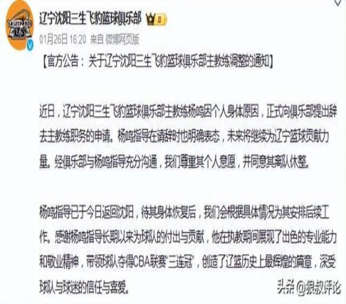杨鸣个人选择请辞,离开辽宁男篮主帅的位置。尽管俱乐部层面全力挽留,但杨鸣离队的心意已决,最终,这名辽宁男篮队史成绩最好的主教练,离开帅位。