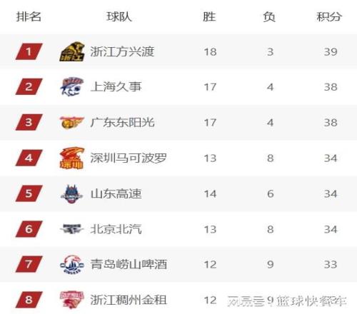 排在积分榜第5名的是山东队,他们的战绩为14胜6负,不过,由于少赛一轮的缘故,山东队在排名上稍微吃亏,目前只能暂居积分榜第5名。而北京队则紧随其后,排在积分榜第6名,他们的战绩为13胜8负,与深圳队一样。积分榜第7名则是青岛队,他们的战绩为12胜9负,浙江队与青岛队一样,也是12胜9负,他们则排在积分榜第8名。目前,积分榜第4-8名的球队,他们之间的差距非常小,任何的一场胜负,都会影响到多支球队的排名。