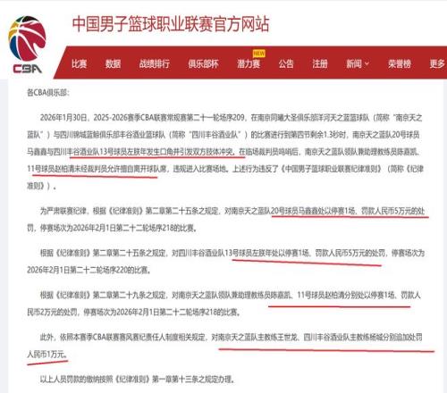 2月1日,中午12点!CBA公司开出一份大罚单,同曦队、四川队一共有4人被停赛,6人被罚款,两队的罚款金额达到160000元。