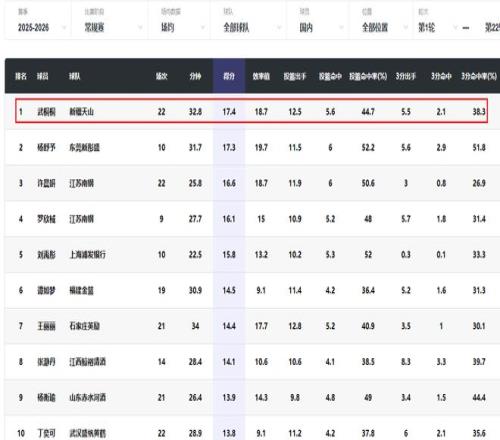 在本赛季的本土球员得分榜上,武桐桐场均得到17.4分排名第一,杨舒予场均得到17.3分排名第二,许晨妍场均得到16.6分排名第三,罗欣棫16.1分第四,刘禹彤15.8分第五。