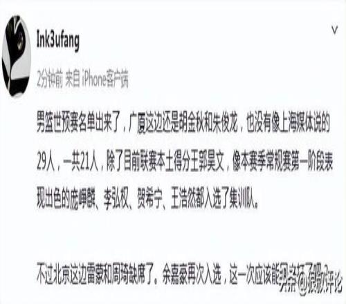 广厦这边还是胡金秋和朱俊龙,也没有像上海媒体说的29人,一共21人,除了目前联赛本土得分王郭昊文,像本赛季常规赛第一阶段表现出色的庞崢麟、李弘权、贺希宁、王浩然都入选了集训队。