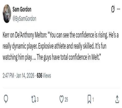 主帅科尔赛后也对梅尔顿大加赞赏:“你能够看出梅尔顿在场上不断提升的自信心,他是一名极具冲击力,运动能力出色,技术也十分扎实的球员,看他打球真的是一种享受,我们都对他充满信心。”