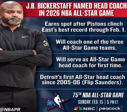 活塞官方晒出海报祝贺比克斯塔夫,同时配文写道:“比克斯塔夫将正式担任26年NBA全明星赛主教练!”