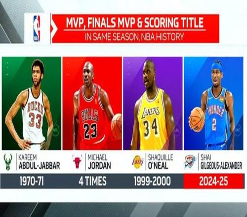 雷霆队当家球星亚历山大在上赛季完成了个人荣誉的大丰收,他收获了常规赛MVP、总决赛MVP以及常规赛得分王的称号。转播方也整理了历史上曾单赛季同时得到这三项荣誉的球员。
