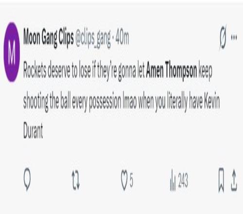 火蜜:火箭如果每一轮进攻都让阿门去发起、终结那必然会输球,尤其是队内还有杜兰特的时。