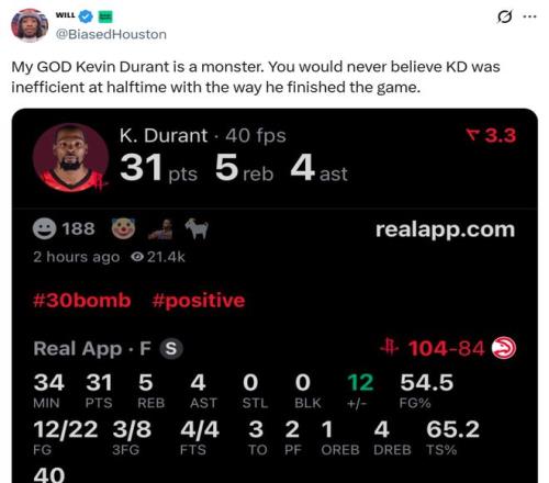 面对杜兰特这样的表现,火箭媒体人也不禁感叹道,在上半场状态那么低效的情况下,最终杜兰特还是能够扭转局面,他真的是个怪物。