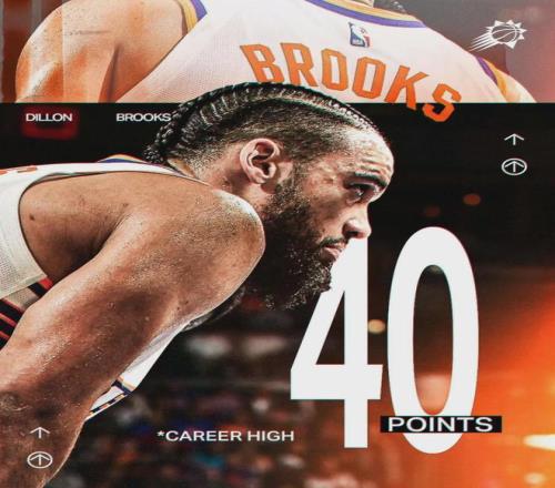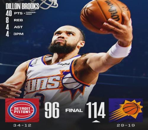 北京时间1月30日,NBA常规赛:太阳114-96战胜东部第一的活塞队。太阳两个进攻核心布克和杰伦-格林因伤休战,狄龙-布鲁克斯扛起球队:22投13中,三分7中4,罚球12中10,狂砍40分8篮板4助攻1抢断1盖帽,正负值+14。