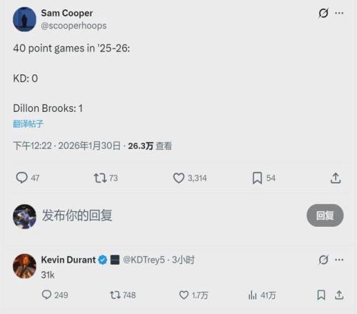 又有其他网友回复杜兰特:“然而你生涯一场60+都没有。”KD继续回怼:“Top 6(NBA总得分历史前六)。”怪不得杜兰特不找女朋友,这时间全花在跟网友对线上面了。尽管本赛季KD在火箭最高分是39分,但死神得分能力毋庸置疑!