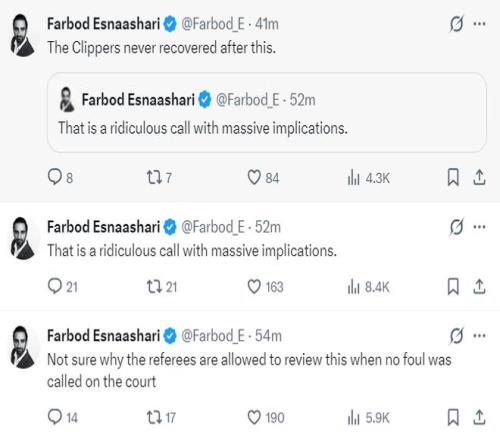 裁判在没有哨子的情况下主动看回放给哨引发了快船记者Farbod Esnaashari的不满,他表示:我完全不明白裁判在没有响哨的情况下看回放是什么意思,这明显是一个违规的行为,那是一个黄灭的决定,而且影响是极其深远的。
