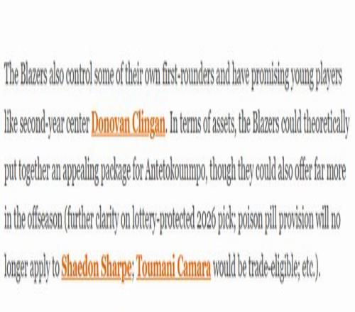 此外,开拓者还握有部分自家首轮签,队中也不乏潜力新星,例如二年级中锋克林根。从筹码层面来看,开拓者理论上能够为得到字母哥拼凑出一份颇具吸引力的交易方案,不过到了休赛期,他们能拿出的筹码还会更加丰厚(2026年受乐透保护的首轮签归属将更加明确;谢登-夏普合同中的毒药条款将失效;图马尼-卡马拉将具备交易资格,等等)。