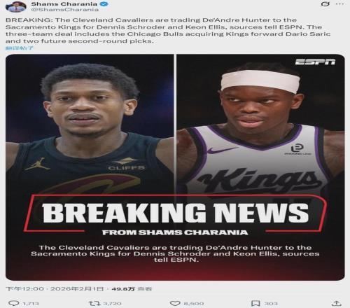 北京时间2月1日中午12点,据NBA名记Shams报道,骑士、国王和公牛达成一笔三方交易:骑士队将德安德烈-亨特交易至萨克拉门托国王队,换来丹尼斯-施罗德和基翁-埃利斯。此外,国王将萨里奇和2个次轮签送到芝加哥公牛队。