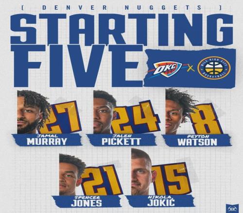 掘金戈登、布劳恩和卡梅伦-约翰逊继续休战,雷霆杰伦-威廉姆斯和卡鲁索也不能打,两队都不是完整阵容。掘金首发:穆雷、皮克特、斯潘塞-琼斯、沃特森、约基奇。雷霆首发:亚历山大、卡森-华莱士、多尔特、霍姆格伦、哈滕。