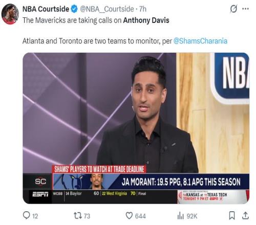 早些时候ESPN记者Shams在节目中表态,独行侠正在积极的听取安东尼-戴维斯的报价,联盟已经有一些球队跟独行侠取得了联系,重点关注的老鹰、猛龙两支球队。人独行侠并没有一定要在交易截止日前送走AD,球队可以等到休赛期再决定,1月初AD遭遇的手部伤势也减缓了交易的进程,因为他的价值正在缩水。
