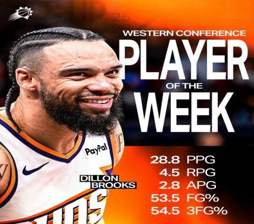 过去一周,狄龙率领太阳打出3胜1负的战绩,场均贡献28.8分4.5篮板2.8助攻,投篮命中率53.5%,三分命中率高达54.5%。