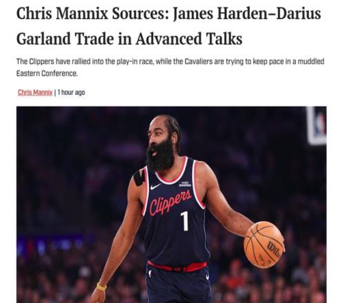 消息最先由《体育画报》名记Chris Mannix曝出,多位消息人士向其透露,快船与骑士正在围绕哈登与加兰互换进行深入讨论。