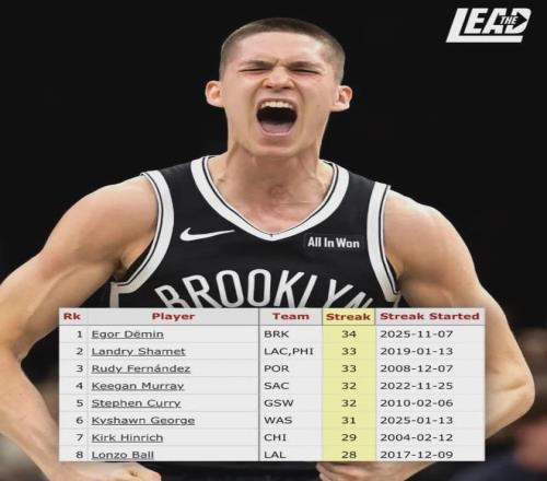 此外,杰明在新秀赛季连续34场投进三分球,超越兰德里-沙梅特(33场),高居NBA新秀历史第一!今天要写的就是篮网8号秀叶戈尔-杰明,最新一期的NBA官方新秀榜,杰明仅排第9。再加上篮网战绩差,所以杰明关注度并不高。
