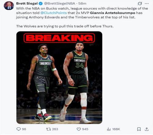 随后NBA记者Brett Siegel报道,扬尼斯把加盟森林狼搭档爱德华兹视为自己的首选,森林狼也正在努力推动扬尼斯的交易。