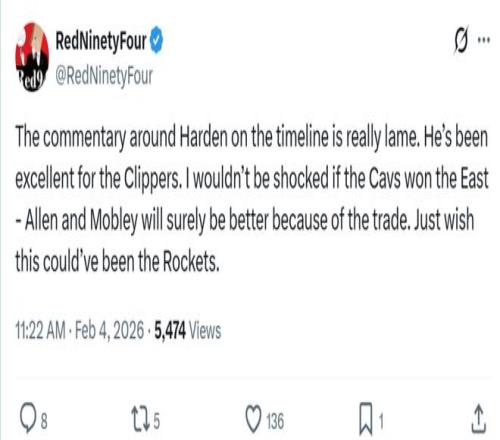 火箭媒体人RedNinetyFour第一时间祝福哈登的同时,坦言火箭队原本也有机会成为得到哈登的球队。