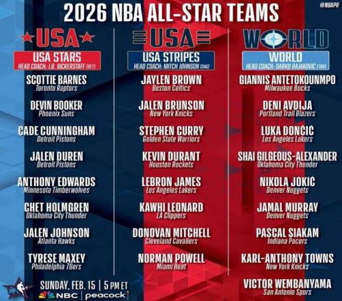 星条队:杰伦·布朗、布伦森、库里、杜兰特、詹姆斯、伦纳德、米切尔、鲍威尔(主教练米奇)