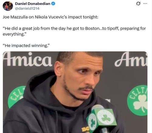 面对武切维奇这样的表现,赛后主帅马祖拉称赞到:“从他到波士顿那一天起,他就全力以赴,为每场开打的比赛做好准备,他也用实际行动左右了比赛的胜负走向。”