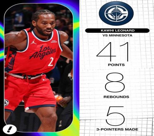 这场比赛,伦纳德又一次交出了炸裂表现:全场出战33分钟,投篮30中14,三分11中5,罚球10中8,拿下41分8篮板2助攻4抢断,在场正负值高达+20。