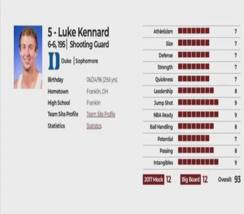 NBA选秀网站综合评分93分,预计选秀顺位12顺位,实际选秀顺位12顺位,选秀模板:尼克-斯陶斯卡斯/杰夫-霍纳塞克.