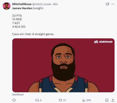 骑士媒体:詹姆斯-哈登多次封盖,多么出色的防守,他再一次在末节发光发热。