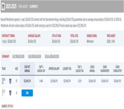 很难想象这支国王队唯一能让球迷驻足的球员会是37岁的威少,这是一个已经拿了4年低廉薪水的老将,2022年784万、2023年383万、2024年560万、2025年330万、2026年363万。