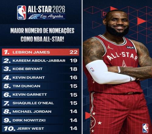 这份榜单最直观的点,就是詹姆斯把“入选次数”拉成了断层:22次不仅是荣誉堆出来的,更是漫长生涯里持续保持顶级影响力的结果。全明星入选说到底离不开两件事:一是每个赛季的出勤与状态不能掉太多,二是你得长期处在联盟关注度中心。能把这两点同时做到,才可能把数字累到这种级别。
