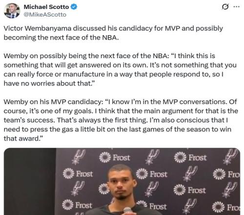 当谈到自己被纳入MVP争夺讨论,文班坦言:“这是我的目标之一,但这基于球队成功,我也需要再加把劲。”