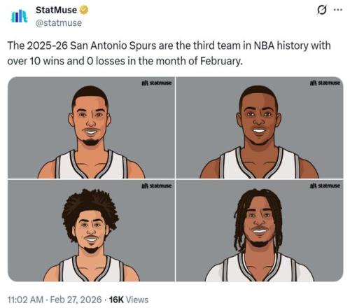 11连胜不仅是现存最长连胜,也是马刺队时隔10年再次拿到11连胜,这让马刺保持2月份至今保持不败金身,队史第三次单月做到至少10胜0负,也是NBA历史上第三支在2月份做到这一点的球队。