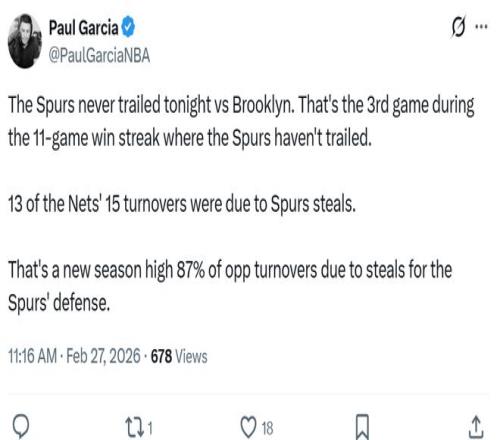 本场篮网15次失误中有13次是马刺队抢断造成,对手87%的失误由抢断造成也创造马刺本季新高。