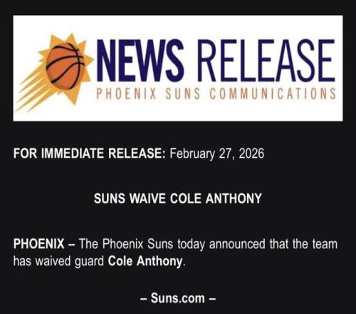 来自名记Shams的最新报道,菲尼克斯太阳已经裁掉了球队后卫科尔安东尼,随后太阳官方发表声明宣布了这一消息。