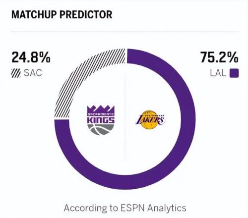 反观国王这边,上一场击败独行侠后,近3场比赛2胜1负,战绩14胜47负位列西部倒数第一。目前这支国王心思完全在摆烂上,小萨、拉文等核心全部赛季报销,球队以锻炼新人为主,不过威少倒是竞争意识不错,雷诺成为球队年轻球员中的佼佼者。赛前,ESPN预测此战的结果:湖人胜率高达75.2%,国王胜率低至24.8%