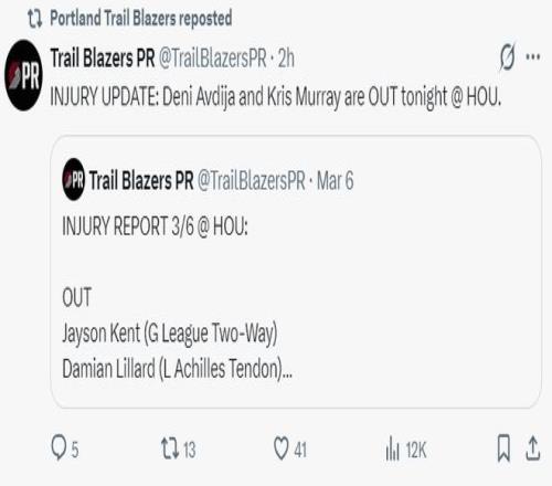 开拓者的阿夫迪亚、乐福、克里斯-穆雷等人都因伤无法登场,杨瀚森还在G联赛。