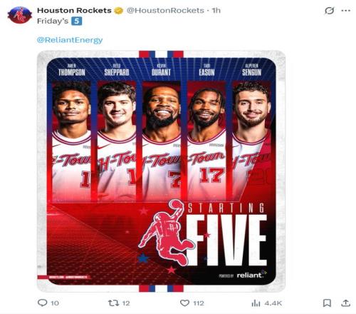 火箭:谢泼德、阿门、杜兰特、伊森、申京;