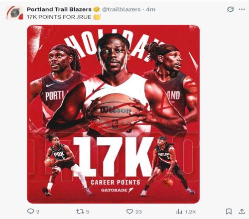 这场比赛霍勒迪完成了个人17000分里程碑。